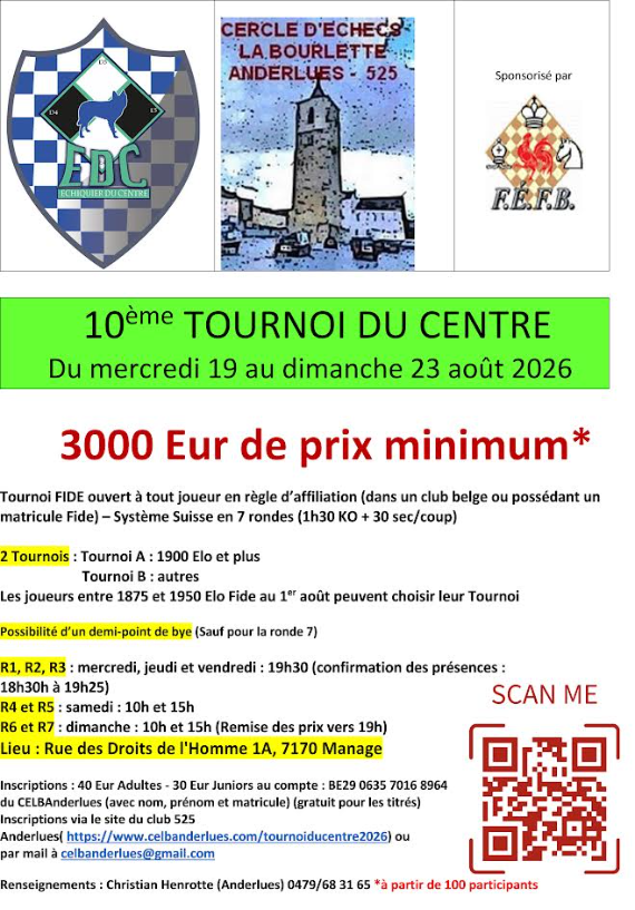 Tournoi FIDE ouvert à tout joueur en règle d’affiliation (dans un club belge ou possédant un matricule Fide) – Système Suisse en 7 rondes (1h30 KO + 30 sec/coup)